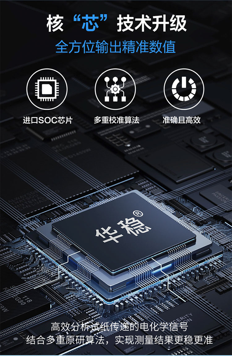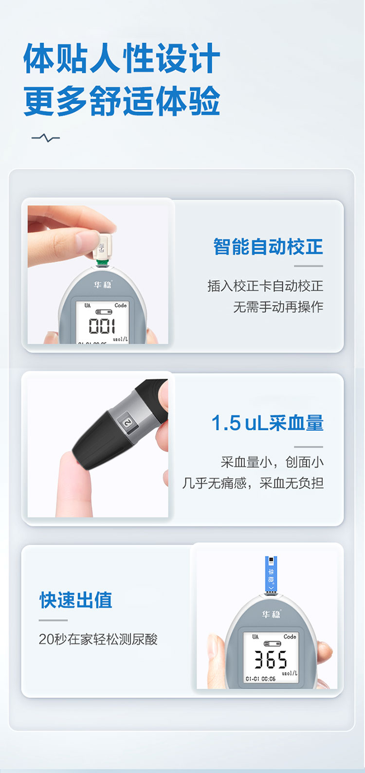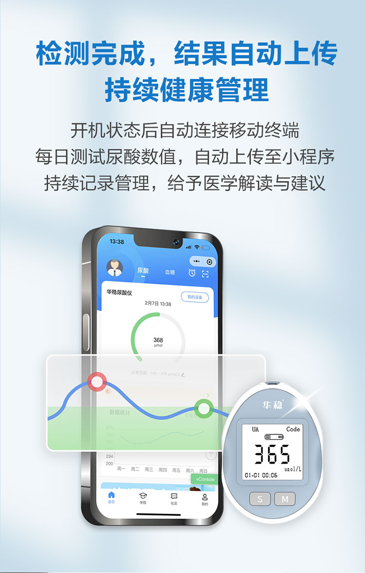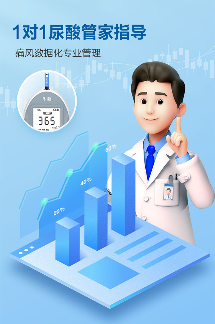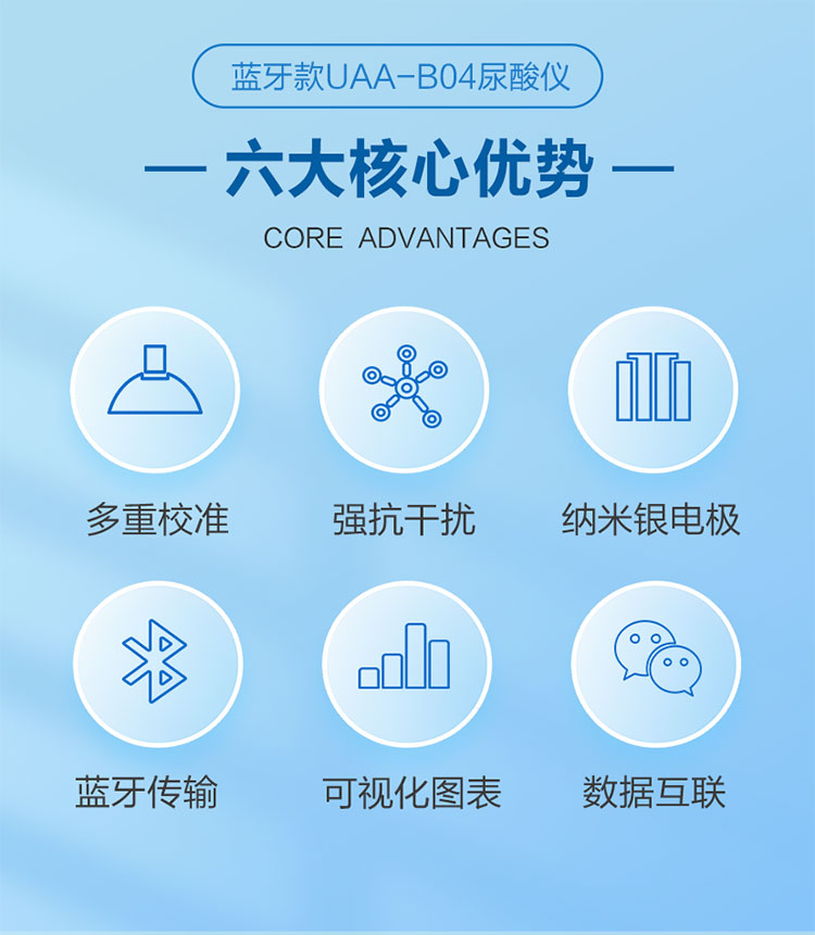 針對臨床使用特點采用便攜式設計,具有操作簡單、使用方便等特點,與公司研發的尿酸分析試條配合使用,可快速檢測血尿酸濃度。廣泛應用于診所、藥店、及家庭個人使用。